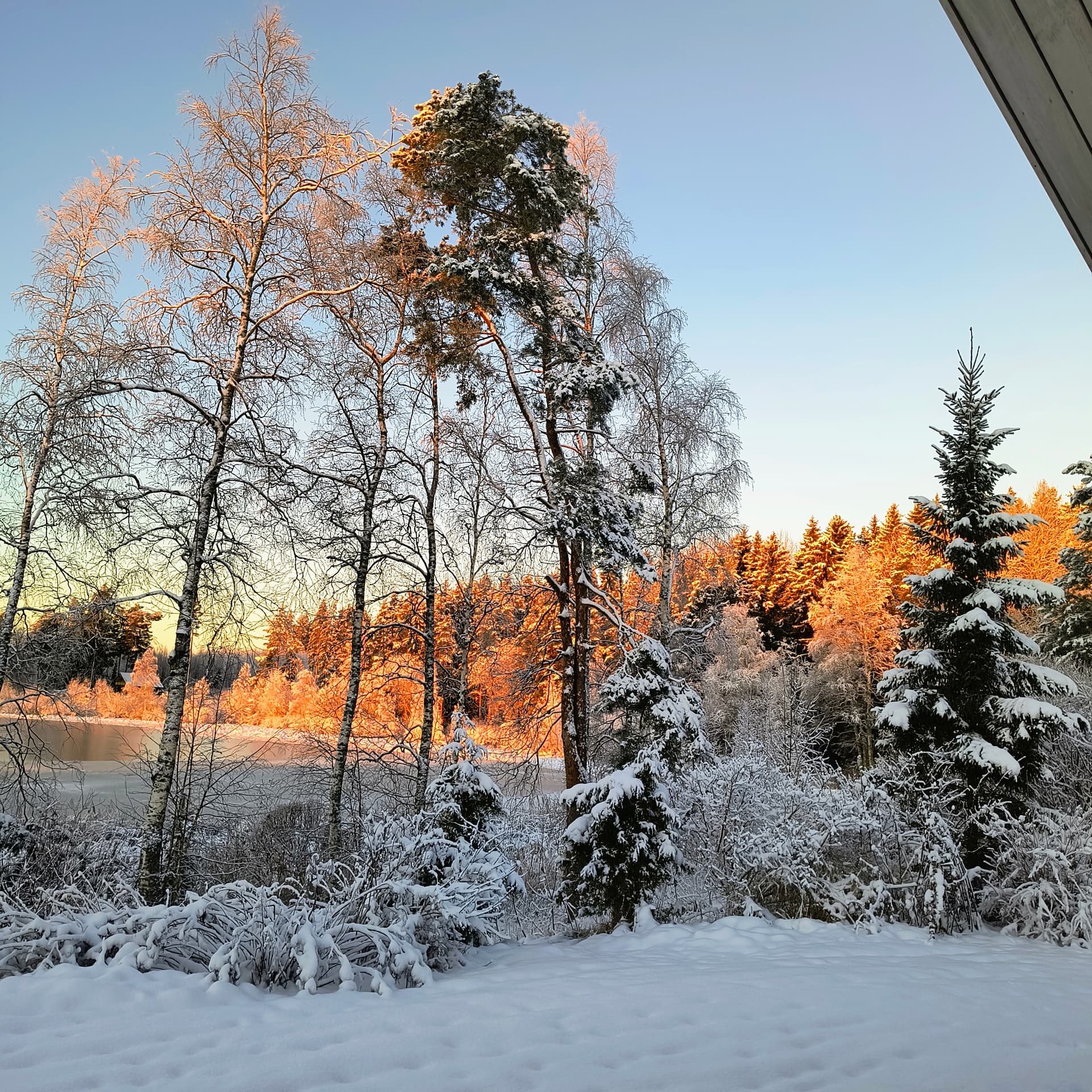 Yöllä oli satanut pieni lumipeite maahan. Tunsin hetken onnellisuutta luonnon kauneudesta ja omasta olotilastani, samalla haikeutta, kun tämä tulee olemaan taaksejäänyttä elämää. Vielä ei tiedä, miten jatkossa asiat järjestyy.