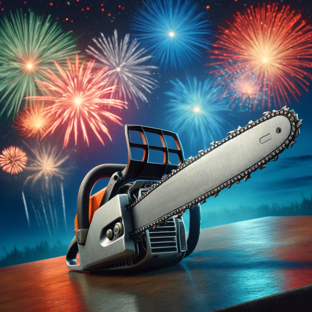 Onnittelut viidestäkymmenestä päivästä moottorisahan ja ilotulituksen kera
